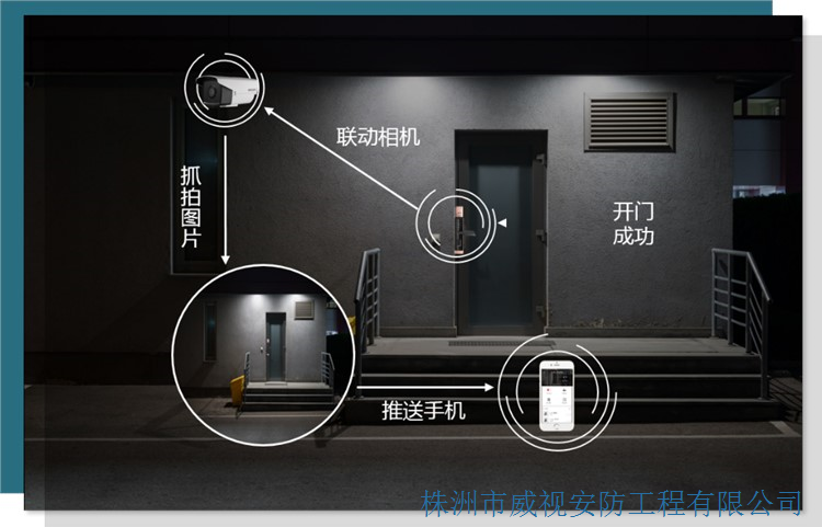 智能聯(lián)動:智能鎖和攝像機實現(xiàn)聯(lián)動抓拍,開門的同時抓拍監(jiān)控畫面?zhèn)魉偷绞謾C,便于核實進出人員和事后查證。
